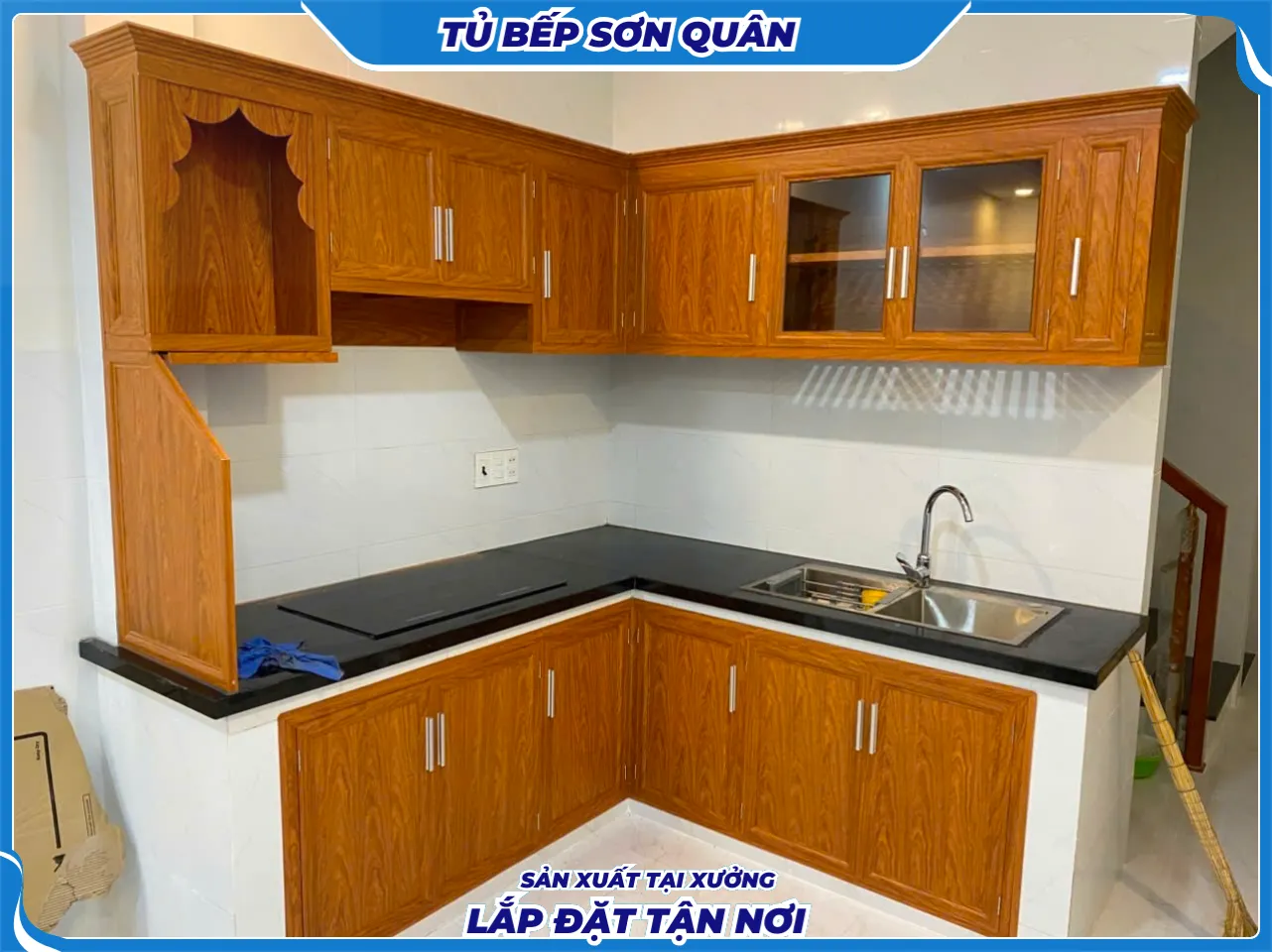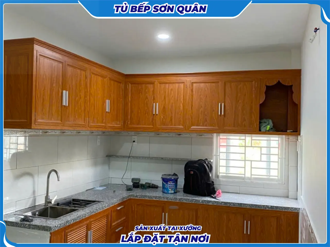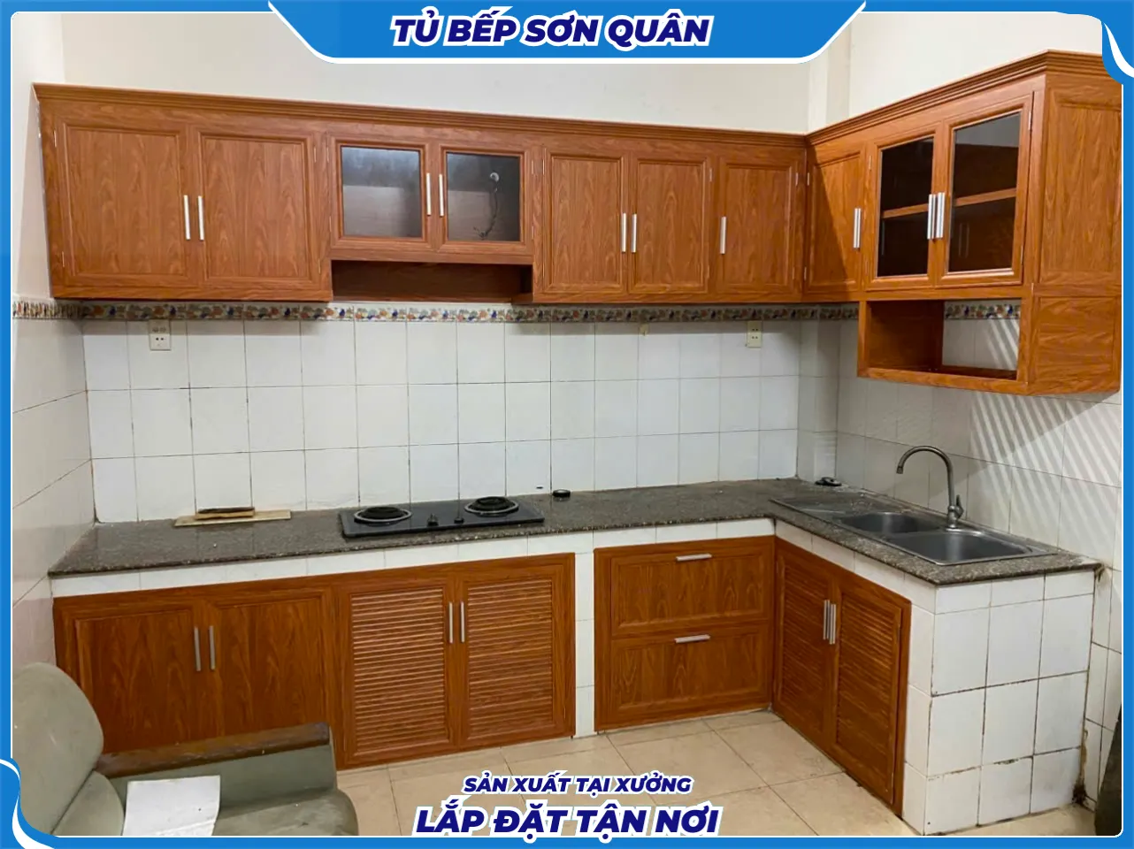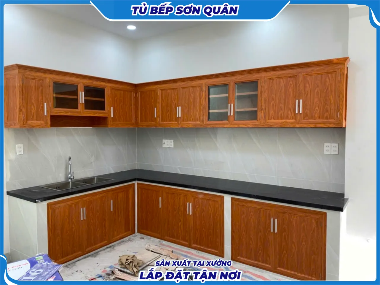 Tủ bếp nhôm Xingfa giả gỗ: 2.200.000 – 2.800.000 VNĐ/m dài.